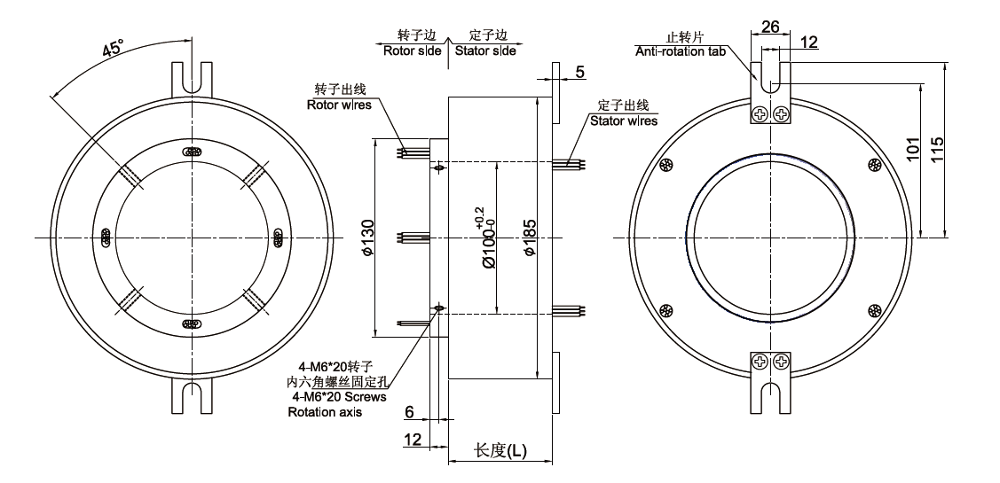 • · 外徑185mm, 通孔直徑為100mm(適用于<=100mm)的標(biāo)準(zhǔn)系列整體式精密導(dǎo)電滑環(huán)。*注意:如需<100mm的內(nèi)孔,可通過加內(nèi)襯軸套解決。