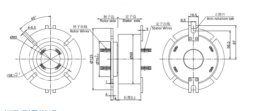 • · 轉子法蘭安裝, 外徑99mm, 通孔直徑為38.1mm,(適用于<=38.1mm)的標準系列空心法蘭導電滑環(huán)。*注意:如需<38.1mm的內孔,可通過加內襯軸套解決。