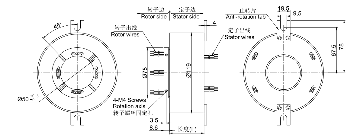 注:以上的各種規(guī)格的導(dǎo)電滑環(huán),電路旋轉(zhuǎn)連接器,電旋轉(zhuǎn)接頭,10A和 信號(5A)可以任意組合,詳細請咨詢客服?稍跇藴十a(chǎn)品上進行非標定制滑環(huán),請咨詢客服。 標準圖紙