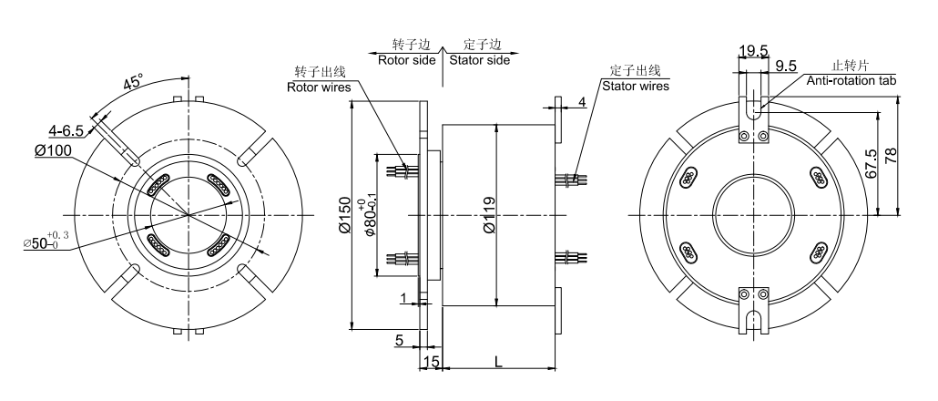 • · 轉(zhuǎn)子帶法蘭, 通孔直徑為50mm(適用于<=50mm)的標(biāo)準(zhǔn)系列過(guò)孔式導(dǎo)電滑環(huán)。*注意:如需<50mm的內(nèi)孔,可通過(guò)加內(nèi)襯軸套解決。